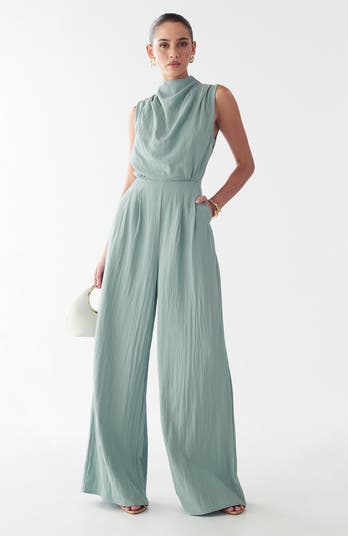 The ANNIE JUMPSUIT by BWLDR is a sophisticated wide-leg design that captures contemporary elegance with understated charm. Its draped neckline and fluid lines create a refined silhouette that transitions effortlessly from day to evening. The soft sage hue adds a serene, modern touch to this versatile statement piece.