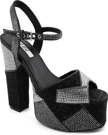Lustrous crystals illuminate the geometric panels on a patchwork-inspired sandal lofted by a chunky platform and towering block heel.