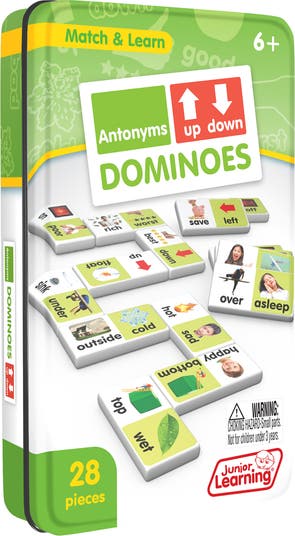 Match and Learn Language Arts with Junior Learning Antonym dominoes are a great learning resource and an excellent manipulative for reinforcing key concepts. It includes 28 piece set of melamine dominoes. The dominoes come in a collectors tin for storag eand the game guide can be found on the back of it. A perfect addition to your classroom or home learning resources. Children will love and enjoy the feel of real dominoes as they complete the antonym matching game. Dominoes measures 1.9 x 1 x 0.25 inches. For ages 6 - 11. Grade 1 - Grade 5. WARNING: CHOKING HAZARD-Small parts. Not for children under 3 years.