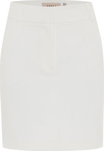 A tailored chino-inspired skirt with a trouser-style front closure, offering a refined take on modern suiting. Designed with side pockets and a sleek silhouette, this piece pairs perfectly with the matching split-sleeve jacket for a coordinated look.
