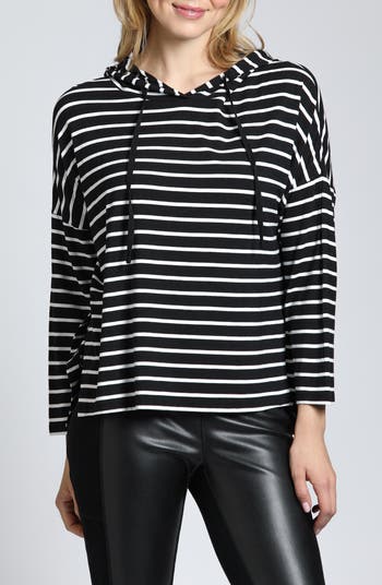 Side slits ease the silhouette of a casual hoodie covered in stripes and ready for beach walks and cozy afternoon hangs.