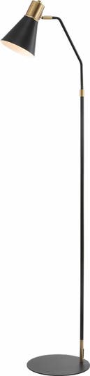 Modern and functional, the floor lamp has a matte black finish accented with brass-gold. The metal shade s white lining maximizes light output, for the perfect work or reading lamp. The flat round base slips easily under the edge of a chair or sofa. Solid black metal shade directs light downwards, right where you need it. The 72” cord has a convenient in-line switch, and is silk-wrapped for an elegant finish.