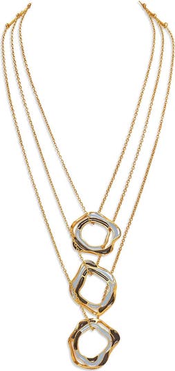 Handcrafted in heavily textured brass with pastel blue and black enamel, this striking layered necklace is completed with 22k yellow gold micron plating and has adjustable links that connect the chains at the back.