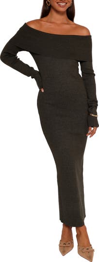 Give your curves a hug in this stretchy sweater-dress with a bold fold-over neckline that bares your shoulders.
