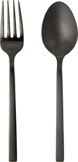 This contemporary serving set featuring a brushed black finish and square handles is made from high-grade stainless steel, resulting in a balanced handfeel.