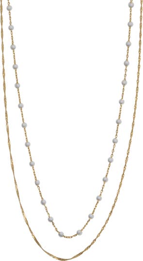 A distinctive, delicate Singapore chain is paired with a shorter complementary chain stationed with white-enamel cabochons for an easy, elegant layered necklace made from sterling silver plated in 18-karat gold.