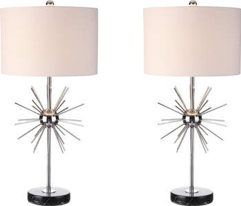 A classic starburst of polished chrome lends eye-catching visual appeal to the sleek, simple design of this stately chrome-and-marble table lamp. A stellar addition to any space, the 31.5" of height and midcentury modern design are sure to make this lamp stand out wherever you style it. With a marble base for stability and silk-wrapped cord, no design detail was overlooked in the creation of this striking piece.