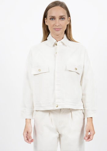 The Arizona Denim Jacket in Alto features a stylish design with long sleeves, buttoned cuffs, and wide shoulders. It includes a front button placket and patched pockets with flaps, made from upcycled materials.