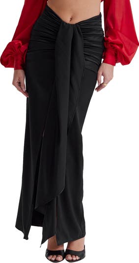 This silk maxi skirt with plenty of stretch is topped with shapely ruching and finished with a cascading drape that overlaps the stem-showing vent.