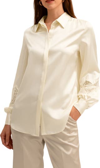 Graceful and feminine, the Armeria Lace Blouse features delicate lace detailing on the sleeves and a concealed placket for a touch of luxurious, vintage flair. Crafted in a timeless and tailored silhouette, this elegant blouse is the an artful combination of whimsical and classical style.
