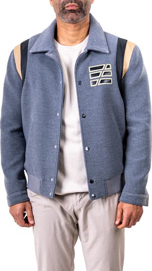 Lambskin-leather colorblocking at the shoulders puts a motorsports-inspired spin on this jacket cut from rich wool.