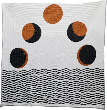This reversible, hand-printed quilt on a crisp white base presents a modern take on lunar motifs. One side showcases a prominent brown moon, while the flip side features the lunar cycle in shades of black and brown. It s a contemporary piece offering two distinct yet cohesive designs. Each quilt is handmade from 100% cotton and requires attention from four artisans, including wood carvers, block printers, quiltmakers, and dye specialists. The design is hand-pressed onto each quilt using hand-carved wooden blocks dipped in dyes. The printed cotton shells are brought to the homes of quiltmakers, who stuff and stitch the quilts by hand, creating the final product. CQC LA quilts are made in small batches. Due to the handcrafted nature of this item, expect slight variations in the appearance of each unique piece.
