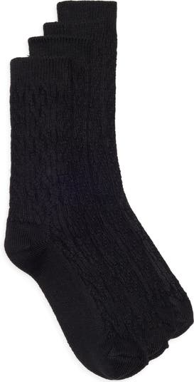 A timeless cable-knit design adds to the cozy flair of these supersoft crew socks featuring reinforced heels and toes for durability.