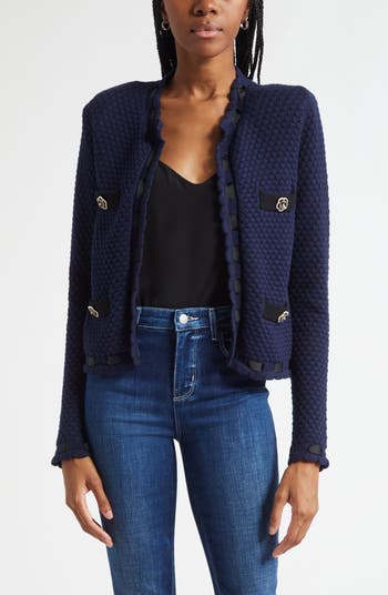Contrast trim accentuates the scalloped edges of a textured sweater embellished with delightful floral hardware.