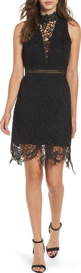 Wispy ends of the lace overlay create uneven edges, giving this sleek sheath a flirty-yet-goth edge.