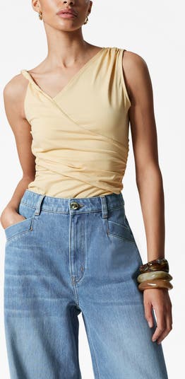 A side drape shape the silhouette of this sophisticated sleeveless top punctuated with a sleek asymmetric neck and hem.