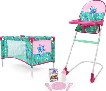 BABY ALIVE: AT HOME SET - 7PCS - GREEN, PINK, HEARTS - The Baby Alive at Home 7 Piece Set offers a collection of delightful accessories for imaginative play. This set includes a Doll Play Yard, Doll Highchair, and 5 Piece Feeding Accessories. The Baby Alive Play Yard serves as a cozy bed for your child s baby doll or plush, featuring mesh sides for easy monitoring and space for multiple dolls. This versatile play yard is also travel-friendly, assembling and packing into a compact size for sleepovers or trips. The Feeding Highchair boasts a sturdy steel tube base and a colorful seat that comfortably accommodates dolls ranging from 12 to 18 inches. The set s feeding accessories, including a plate, fork, spoon, feeding bottle, and food box, add to the realism of nurturing play. With this At Home 7 Piece Set, little parents can engage in a perfect blend of fantasy and real parent role-play with their favorite dolls and plush characters. INCLUDES: Doll Play Yard, Highchair, Feeding Accessories. PRODUCT DIMENSIONS: Play Yard: 16.9 (L) x 10.8 (W) x 11 (H) inches. Highchair: 11.2 (L) : 15.1 (W) x 26.3 (H) inches. Suitable for dolls up to 18 inches (46 cm). **Doll Not Included.** Suitable for girls boys ages 3 and up.