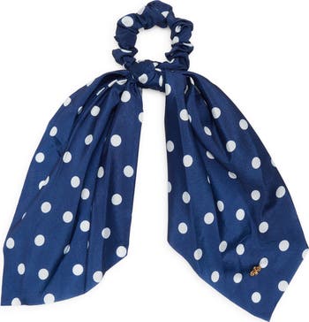 Elevate your ponytail game with this scarf-tie scrunchie decorated in classic polka dots and a gilded bee charm.