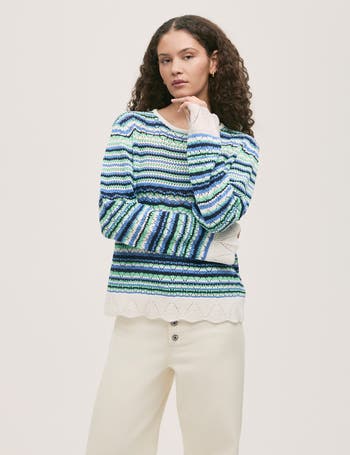 With scallop ribbed detail at the hemline and cuffs, Audrenia is a crochet sweater with long sleeves and dropped shoulders for a relaxed fit.