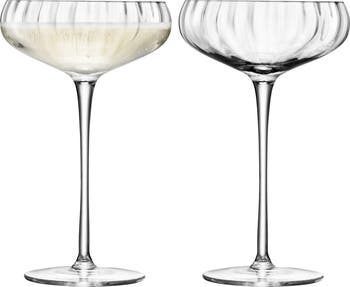 Hand-blown fluting lends light-reflecting optics to these delicate champagne saucers finished with tall stems.