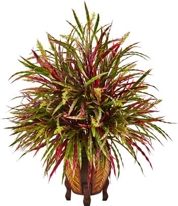 This Autumn Grass Arrangement is bursting with textured and colorful grassy leaves. The arrangement comes with a textured woven vase with sturdy, dark brown legs. This explosion of colors brings an autumnal touch to a living room, sun room or even bedroom.