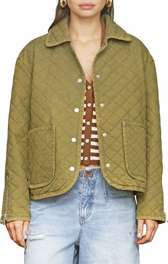 Heavy-duty zip cuffs and oversized patch pockets further the workwear vibe of this washed and distressed diamond-quilted cotton jacket. Designed in a boxy, relaxed silhouette.