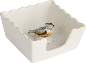 - A vibrant stoneware napkin holder, adorned with a bird-shaped weight, brings a splash of color and joy to any table