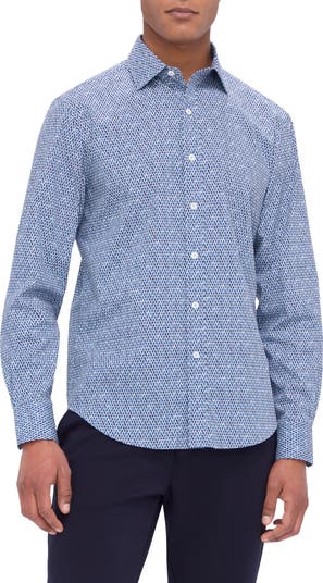 An eye-catching geometric print sharpens a stretch-cotton sport shirt cut for a modern, shaped fit that looks good tucked or untucked.