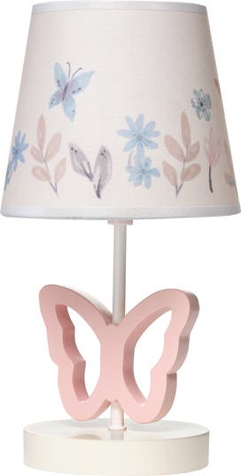 This three-dimensional sculpted butterfly lamp will add a soft glow to your child’s room. A pretty butterfly with graceful open wings decorates this lovely lamp. Colorful watercolor butterflies and flowers decorate the light cream lamp shade. The total height of the lamp and shade is 13 ¼”. The lamp comes complete with an energy efficient light bulb (equivalent to 60 watts) that uses less energy.