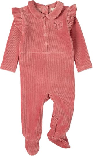 Love today s sporty-girly look? You ll appreciate this charming footie with its tailored faux-snap front, pretty Peter Pan collar, and oh-so-feminine ruffles. It comes in cotton-rich corduroy, extra-plush for velvety softness. Plus, it has functional snaps in back for fuss-free diaper changes.