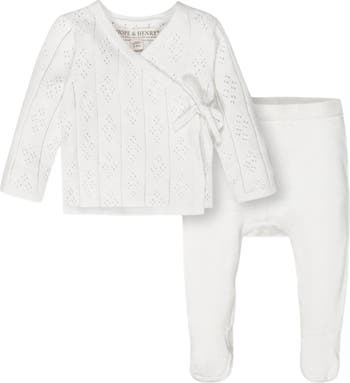 Our sweet matching sweater set in soft organic cotton features a long sleeve wrap top and a cozy footed legging to keep baby warm. A delicate pointelle stitch adorns the top which has small tie closures at the sides. The perfect baby shower gift or heirloom piece for your family.