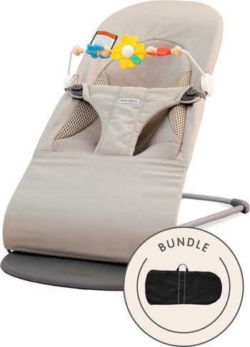 A bouncer, toy bar and transport bag make traveling a breeze with this all-in-one bundle. Baby-powered and battery-free, this ergonomically designed bouncer supports your baby s back, neck and head as it rocks gently to every kick and wiggle. A colorful toy bar in a pleasantly tactile, high-contrast design connects easily to the bouncer to keep your wee one occupied. Three adjustable positions take your little one from upright to reclined, and it folds flat for easy storage or travel. Once your child can sit without help, just flip the washable cover to convert the bouncer into a comfortable seat.