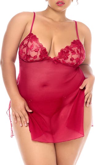 A sheer design and soaring side slits amplify the allure of this babydoll chemise and coordinating G-string set.