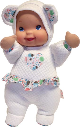 BABY S FIRST: LOVE BEAR BABY DOLL - WHITE - Our baby entertains your baby! Our Baby s First Love Bear in a Quilted White Outfit dolls are the perfect musical companion for your or a loved one s child. Press the tummy, and Love Bear will play This Little Light of Mine! Love Bear dolls are crafted with contrasting super-soft fabrics that are irresistible to touch, providing ultimate comfort and tactile delight. Ideal for playtime, music time, and sleepy time, Love Bear offers endless versatility and companionship. Whether your little one is engaging in imaginative play or winding down for the night, Love Bear is the perfect doll for every moment of their day! Love Bear is designed for easy care with its machine-washable feature. Just remove the sound module, and you can place Love Bear directly into the washing machine for a thorough and hassle-free clean, ensuring it stays fresh and ready for cuddles with minimal effort. Create sweet, life-long memories with our Love Bear dolls. Happy Babies, happy moms! Smart Age Rating: Our Hug Luv undergoes independent testing to ensure it meets the highest safety standards for the appropriate age grade, providing peace of mind for parents and a secure play experience for your child. Perfect for babies 3 months and up. INCLUDES: Soft Body Doll, 2 Button Cell AG13 Batteries.