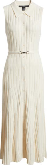 A button-front, maxi-length sweater dress with a collared sleeveless bodice and A-line skirt is knit from a cozy yarn blend with a hint of stretch for a snug, curve-defining fit.