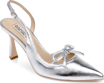 Glistening rhinestones and pearly beads exude elegance along the instep bow of a half d Orsay satin pump fashioned with a sharp pointy toe and slender flare heel.