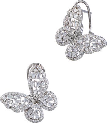 Accessorize in sparkling style with these fanciful butterfly earrings set with round and baguette stones.