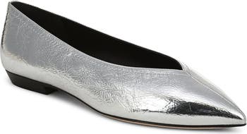 A V-cut topline and pointy toe add sharp angles and dimension to a streamlined leather flat that will complement your desk-to-dinner wardrobe.