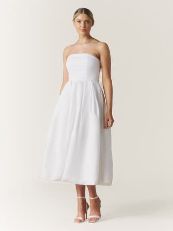 A collection for the modern day bride, designed for a minimal look but a forever kind of love. Understated and effortlessly romantic. Crafted from a matte satin fabric with functional pockets, boned to create a structured shape and silicone edging for added support.. The oversized bow on the back makes a statement, and is removable. The box pleated detail gives an exaggerated silhouette.