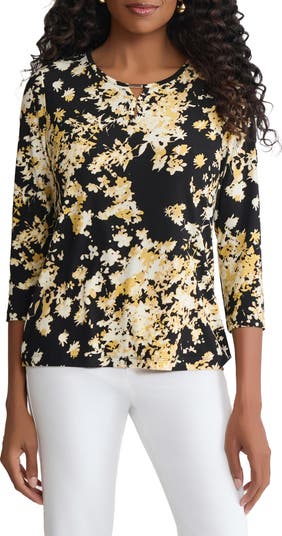 Effortlessly polished, this floral top features a metal bar at the neck above a small keyhole. The relaxed fit and three‑quarter sleeves make it perfect for desk-to-dinner looks.