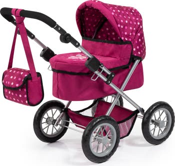 BAYER DESIGN DOLLS: TENDY PRAM - MAGENTA,WHITE DOTS, UNICORN - The Trendy doll s pram matching handbag showcases a beautiful magenta, white dots and unicorn design, making it a stylish accessory for any young doll mom or dad. Designed to accommodate dolls and plushies up to 18 inches, this pram is the perfect companion for imaginative play. With its adjustable handle, it is not only suitable for the smallest of girls and boys but will also grow alongside them. Its large wheels effortlessly conquer uneven terrain, ensuring smooth and comfortable rides. Furthermore, it has a quick-folding mechanism, making transportation and storage simple. The integrated shopping basket offers ample space to store all the essentials needed for a day out with the doll parent and their little darling, adding practicality to its undeniable charm. Your child will be the envy of the neighborhood with this beautiful, trendy and fashionable stroller. Elevate playtime to new heights with this Trendy Pram, where style meets functionality in the most delightful way. Encourages independent play and nurturing skills. Pretend play as mommy and daddy. Includes: 1 Doll Trendy Pram 1 Matching Handbag. Suitable for boys and girls ages 3 and up.
