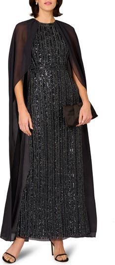 A drapey chiffon cape enhances the graceful movement of this glamorous gown accented with lustrous beading for evening-out allure.