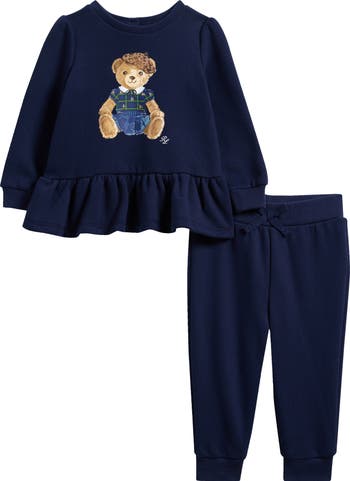 The label s beloved bear mascot lends kid-aproved cuteness to this frilly fleece sweatshirt and coordinating joggers set.