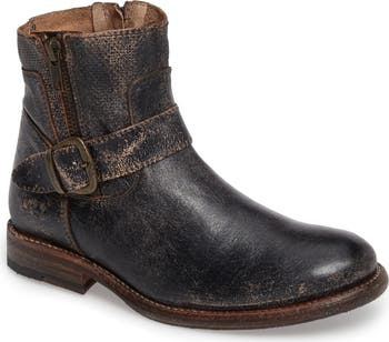 Bold buckle detailing and a weathered finish add to the rustic appeal of a low-heel bootie handcrafted in Mexico from vegetable-tanned leather.