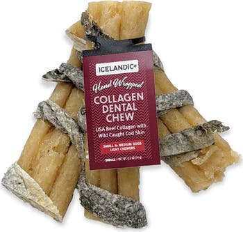 100% Pure Icelandic+ Beef Collagen Dental Chews with Spiral Wrapped Fish Skin 4" Dog Treat. Made of USA Beef Collagen and Atlantic Cod Fish Skin. Ridges are for good Dental Health. Rich in Omega-3 Essential Fatty Acids. Long-Lasting Chew with Multiple Layers. Reduce tartar plaque build-up for healthier gums and teeth. Safe alternative to rawhide. 100% Edible, so they are easy to digest. 100% Natural, no additives, no preservatives, no supplements. 100% Two Ingredient Dog Treat. A 100% awesome Treat! Icelandic+ Beef Collagen Dental Chews with Spiral Wrapped Fish Skin Dog Treats are available in a 4" size. Each package contains 1 dental chew. The Collagen Chews are Hand Wrapped and come from USA Beef and Wild Caught Atlantic Cod Skin. The Wild Caught Atlantic Cod Skins are sustainably sourced and are naturally rich in protein and omega-3 essential fatty acids to help support healthy skin and coat and provide major chewing satisfaction. Dental Care: The Icelandic+ Beef Collagen Dental Chews with Spiral Wrapped Fish Skin Dog Treat is a natural chew that helps your dog’s gums to be “brushed” as it is made extruded beef collagen and naturally dried cod skin. If your dog’s teeth are not regularly brushed, you may experience some gum bleeding with their first chew. This is natural and is actually a benefit as the chews surface is “scrubbing" the gum line. With continued use and additional chews, you will see a difference in the health of your dog’s gum line and whiter teeth. People who do not floss similarly experience gum bleeding when they first start and the bleeding stops when gum health improves from flossing, as will happen with your dog. Both you and your veterinarian will be pleased with the change in gum health and appearance of teeth over time. Important: As with all dog chews, always supervise while your dog is enjoying an Icelandic+ Beef Collagen Dental Chews.