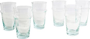 The Verve Culture Moroccan Beldi Glasses, handblown by artisans in Morocco using recycled glass, come in a set of six. Featuring a traditional Moroccan shape, each glass showcases unique, handcrafted details. Designed to be stackable, these eco-friendly glasses offer both timeless elegance and practical space-saving benefits for your kitchen.