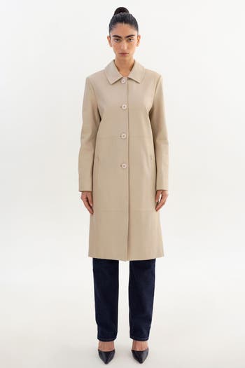 The BELEN Longline Leather Coat offers timeless sophistication with its sleek midi-length silhouette. Made from luxurious lamb leather, this single-breasted coat features a classic 4-button closure and functional inseam side zip pockets. Fully lined for added comfort, it s the perfect piece for adding elegance to any outfit.