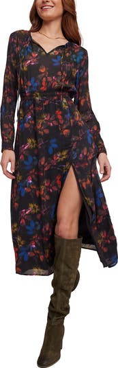 A dark background showcases the romantic blooms tumbling across a side-slit dress cut to a versatile midi length.
