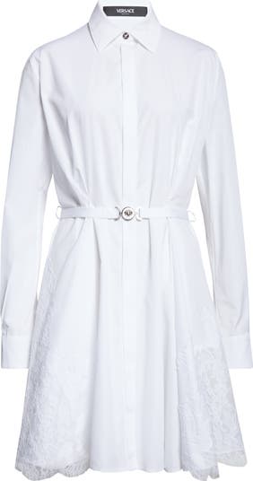 Glinting Medusa hardware—a nod to the molded door of the maison’s first headquarters—brings heritage character to this lightweight cotton-poplin shirtdress adorned with scalloped floral lace.