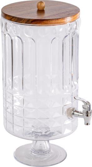This 8-Quart Cut Glass Beverage Dispenser with a Plastic Spout and Acacia Wood Lid in silver and natural colors is a beautiful and functional addition to any home. Crafted from durable glass, this round beverage dispenser features an elegant cut design, complemented by a natural acacia wood lid and a silver-colored plastic spout. Perfect for farmhouse, French country, boho, or transitional interiors, this dispenser is ideal for serving beverages at gatherings and parties. This dispenser combines aesthetics and practicality, measuring 7.5 inches in diameter and 20.25 inches in height. The sturdy construction and easy-to-use spout make this dispenser a must-have for any host.